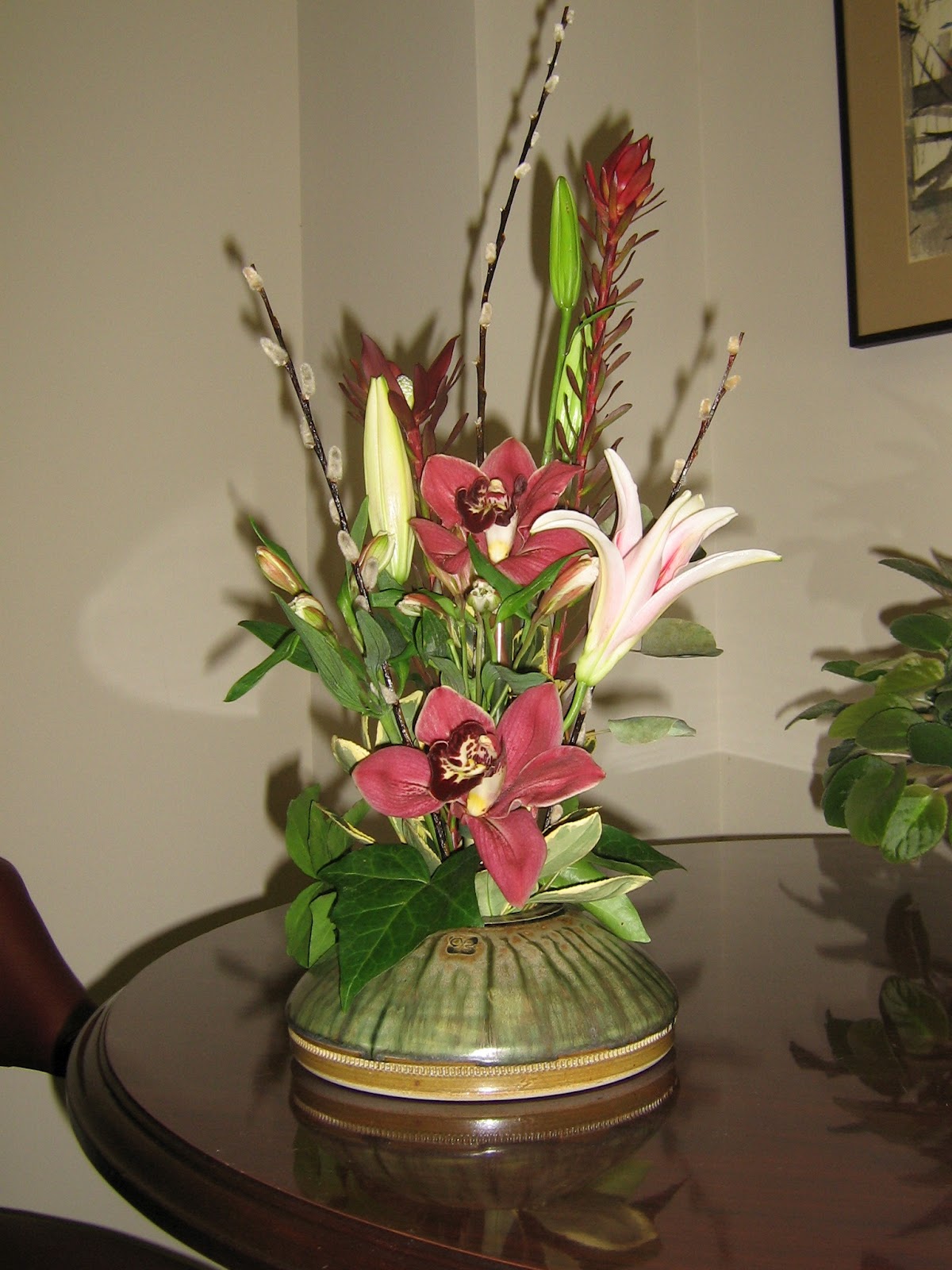 For Valentine's Day someone asked me about doing an arrangement for her husband that looked manly! I always like a challenge. She brought me the ceramic container so I found some orchids in burgundy that I thought fit the bill. My husband basically wears only 4 colors, burgundy being one of his mainstays. These orchids would be gorgeous in a bridal bouquet with the Star Gazer lilies!